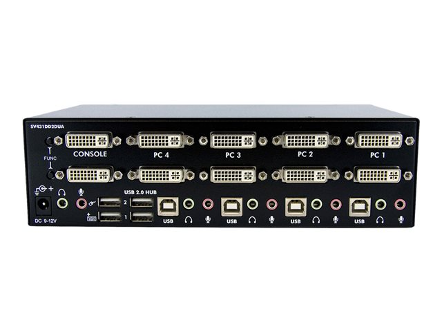 Share a keyboard, mouse and dual DVI displays/monitors between 4 multimedia computers. The SV431DD2DUA 4-port Dual DVI USB KVM Switch allows up to four PCs, each with dual DVI video outputs, to share two monitors, one microphone and set of speakers, one keyboard and one mouse as well as two other USB peripherals. An ideal solution for graphic designers, CAD/CAM designers or educational and financial institutions, the dual view KVM Switch allows you to instantly switch back and forth between dual DVI display PCs at the touch of a button, while maintaining professional level video quality on both monitors. The dual DVI switch also features an integrated USB hub port that allows USB 2.0 peripherals such as thumb drives, external hard drives or web cams to be shared between attached systems - eliminating duplicate peripheral costs. Please Note: While both DVI-I (analog mode) and DVI-D (digital only) are supported by the KVM, both source PCs should output the same signal type for proper switching. It is recommended wherever possible to use DVI-D cables across all PC to KVM and KVM to Console connections. Please contact technical support if you require assistance identifying your source. If you'd like to mount this KVM switch to your server rack, StarTech.com offers a 1U Rackmount Bracket (sold separately) that turns this KVM into a rackmountable KVM.